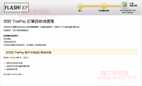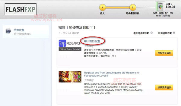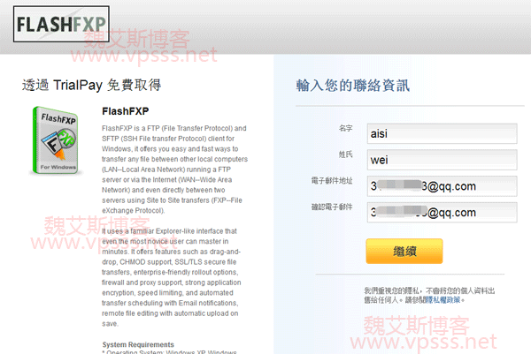 一、点击上面 TrialPay 网站的活动网址,填写个人联系信息,重点是 Email 地址,用来接收 FlashFXP 序列号的。