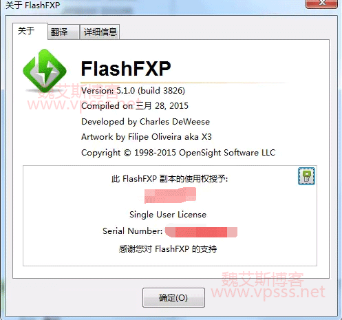 六、把获得的序列号填入 FlashFXP 试用版中,路径为“帮助” – “关于”,即可成功激活为永久正版。