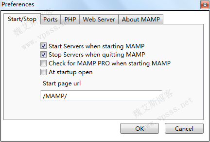 3、配置 MAMP 过程。打开软件后(别用 PRO),选择 Preferences,弹出如下对话框。选择图中所示的两项:打开 MAMP 时启动服务,关闭 MAMP 时停止服务。