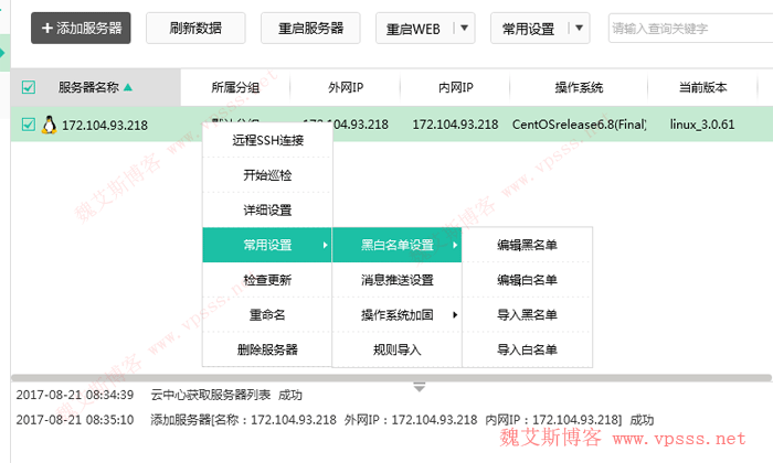 从上图能看到我已经添加好了一台 VPS,在已经添加好的 VPS 上面点击右键,可以看到有 SSH 连接、巡检、黑白名单设置、系统加固、导入规则等等安全类的操作。大家可以自行尝试。