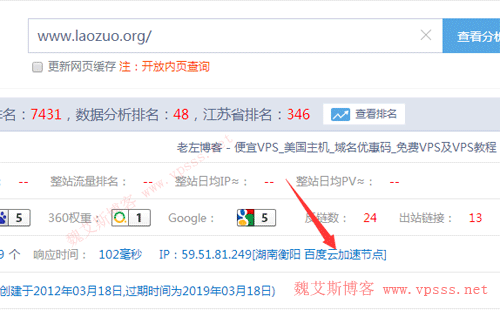 百度云加速最开始是跟安全宝合作开发的,后来看到国内 CDN 加速市场发展空间巨大,干脆收购了安全宝,开始做自有 CDN 加速品牌。因为百度在国内的影响力巨大,绝大多数站长做站都是依靠百度这颗大树存活的,所以很多站长都在使用百度云加速功能。几年前魏艾斯博客也使用过百度云加速产品,不过那时候好像出于初期磨合阶段,网站总是遇到 502 错误导致打不开,很快就放弃了。这不最近看到老左博客在使用百度云加速的免费版本,所以又重新来查看一下。通过站长工具的 SEO 综合查询功能就能看到结果了。