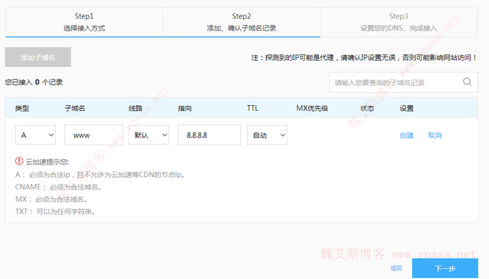 4、提示:验证域名信息中、探测子域名,等待检测完毕。现在添加、确认子域名目录,包括记录类型,子域名,指向 IP 是多少,填好后点击后面的“创建”。这时候就添加成功一个二级域名了。后期也可以自行编辑、改动。点击“下一步”继续安装过程。