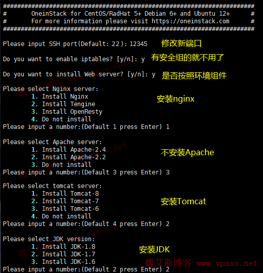 默认端口 22,这个必须修改为 5 位数的提高安全性。iptables 是一键包自带防火墙,如果你使用阿里云、腾讯云、华为云等国产大牌商家的 VPS,自带了安全组,也可以不安装这个 iptables。剩下的就是是否安装 nginx,apache,要支持 JAVA 就要安装 Tomcat 和 JDK。