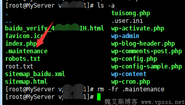 用 SSH 软件删除 .maintenance 。进入 wordpress 的根目录,执行以下命令: