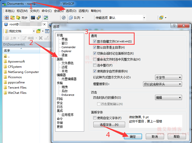 以 WinSCP为例,连接服务器后点击【选项】,弹出菜单再次点击【选项】,在对话框中找到【面板】,右侧找到【通用】显示隐藏文件,勾选,最下面确定后,就看到 .maintenance 文件了,删除后刷新网站前后台页面,可恢复正常访问。