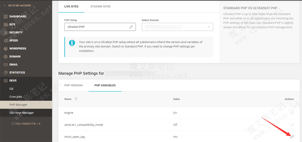 上图中的 Ultrafast PHP设置是说PHP变量应用于网站上的所有子域和文件夹;如果使用 Standard PHP,要选择等待编辑 php变量的域名。对于二者详细情况请移步Ultrafast PHP与 Standard PHP介绍及区别。